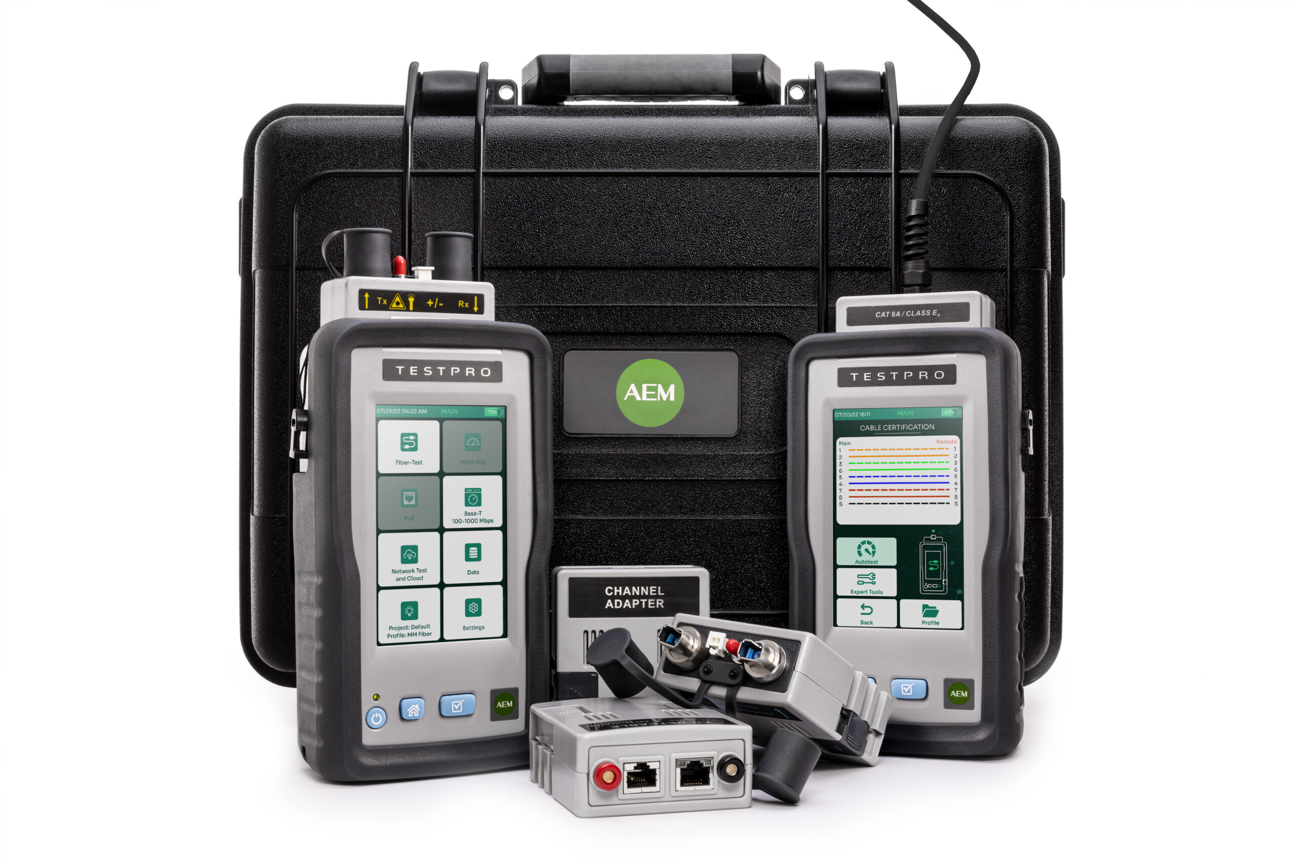 AEM’s TESTPRO-K51E is a complete certification kit for copper and fiber optic links, ideal for professionals who require a versatile, accurate and advanced solution. Based on the powerful TestPro CV100, this kit allows certification and diagnostic testing of mixed network installations.