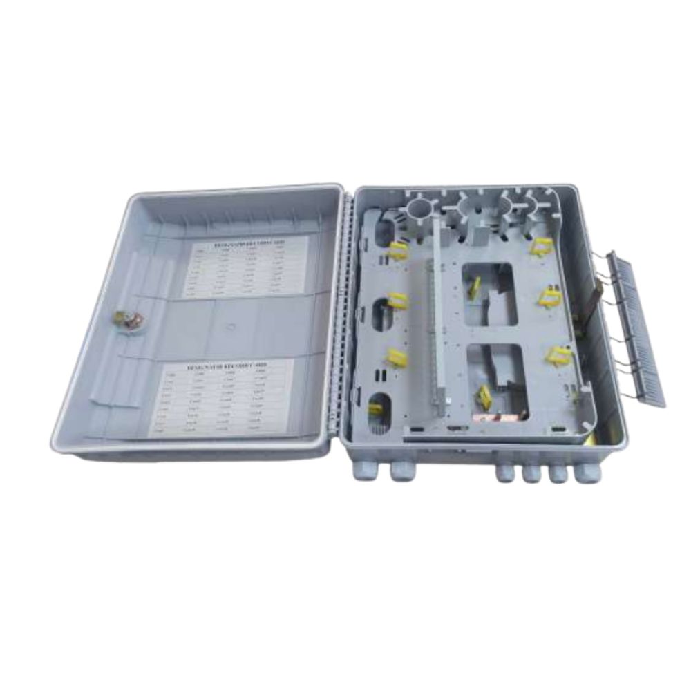 Caja distribución F.O. estanca, hasta 96 empalmes con corte de fibra.